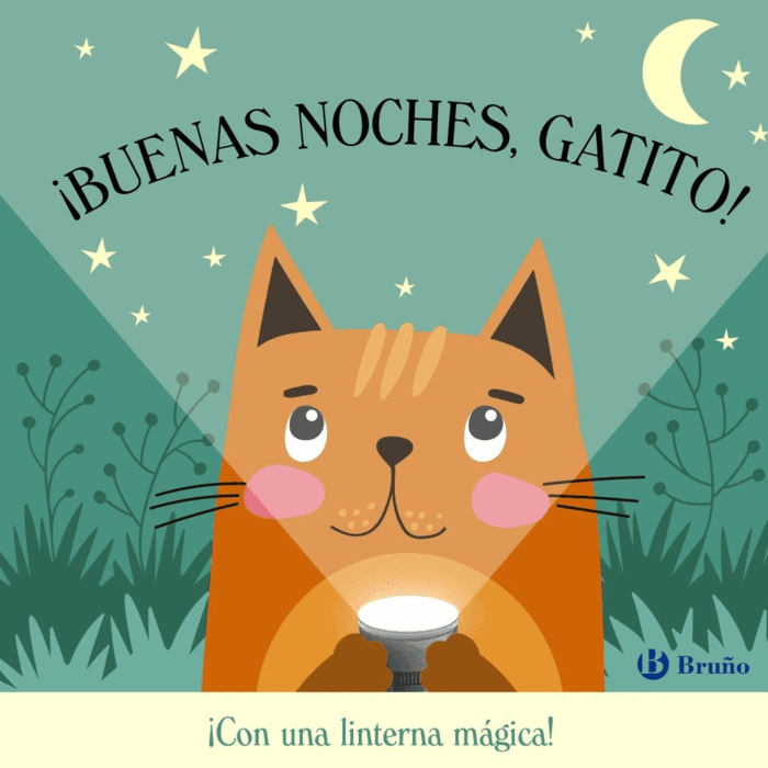 Ha llegado la hora de irse a dormir, pero antes Gatito quiere dar las buenas noches a sus amigos. ¡Ayúdalo a encontrarlos! ¡Mete la linterna tras la lámina transparente e ilumina las escenas!