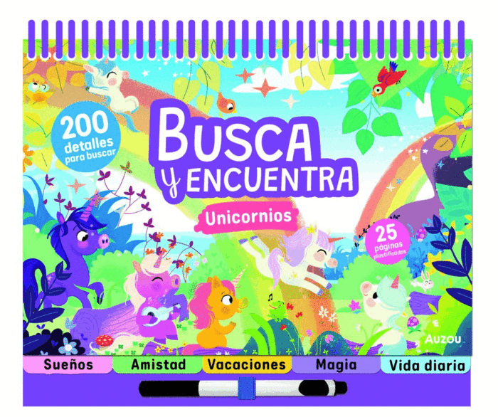 ¡Un busca y encuentra divertido e ingenioso para horas de juego! 5 temáticas mágicas alrededor del universo de los unicornios: el sueño, la amistad, las vacaciones, la magia y la vida cotidiana.