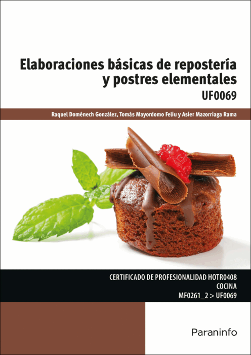 Este libro desarrolla los contenidos de la Unidad Formativa (UF0069) Elaboraciones básicas de repostería y postres elementales, incluida en el Módulo Formativo (MF0261_2) Técnicas culinarias, correspondiente al Certificado de Profesionalidad HOTR0408 Cocina, perteneciente a la familia profesional de Hostelería y Turismo, y regulado por el Real Decreto 1376/2008, de 1 de agosto, modificado por el Real Decreto 619/2013, de 2 de agosto. En él se explica cómo realizar toda clase de elaboraciones básicas de repostería y postres elementales realizados con productos de pastelería. Se estudian la maquinaria y el utillaje con los que realizar dichos postres y se analizan en profundidad las materias primas más comunes en dichas elaboraciones. También se tratan las preparaciones básicas de múltiples aplicaciones propias de la repostería y se ahonda en cada una de sus técnicas. Del mismo modo, se presta atención a las técnicas de cocinado empleadas en la elaboración de preparaciones de múltiples aplicaciones de repostería y postres elementales, y se estudian las características de estos últimos. Asimismo, y dada su importancia, se abarca la regeneración de los productos utilizados en repostería, las fases del proceso, los riesgos de ejecución y el control de resultados de cada uno de ellos. Por último, se presta atención a la presentación y la decoración de postres elementales para lograr postres creativos y llamativos. Además, cada capítulo cuenta con gran número de figuras e imágenes, fichas técnicas y cuadros. También ofrece útiles actividades finales para repasar y afianzar los conocimientos adquiridos. Asimismo, el enfoque elegido es práctico y el lenguaje empleado, claro y sencillo para que la compresión y el aprendizaje de los contenidos sean lo más efectivos posible. Por ello, esta obra es una herramienta utilísima e imprescindible tanto para alumnos y profesores como para todos aquellos que quieran iniciarse o profundizar en el apasionante mundo de la repostería. Los autores son profesionales del sector de la hostelería y el turismo y están especializados tanto en Pastelería como en Cocina y Gastronomía. Cuentan con un amplio bagaje en el sector de la restauración y actualmente son profesores de Formación Profesional de los Ciclos Formativos de grado medio de Cocina y Gastronomía y de grado superior de Dirección de Cocina, así como de diferentes cursos de posgrado y especialización.