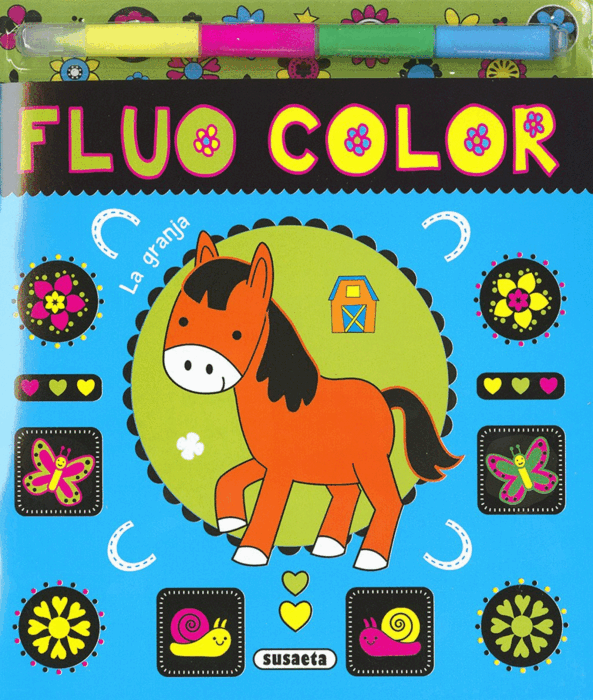 Colorea los animales de la granja con los rotuladores fluorescentes que incluye el libro. Hay cuatro colores diferentes. ¡Llena de color las láminas del libro y haz que los dibujos destellen un brillo inigualable!