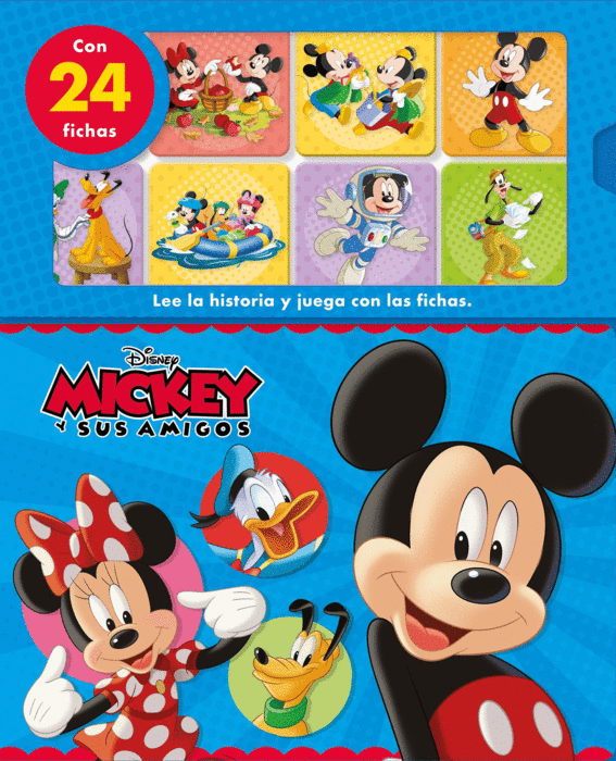 Lee el libro y busca entre las 24 fichas a los personajes de Mickey y sus amigos que salen en cada página. Cuando hayas terminado, ¡coloca todas las fichas bocabajo y diviértete jugando al memory!