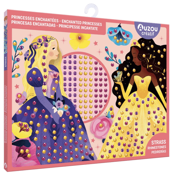 Un kit que propone 4 bonitos vestidos de princesa para decorar con gemas multicolores. ¡Haz que estas 4 bonitas princesas y sus preciosos vestidos brillen y resplandezcan con las coloridas gemas incluidas! Un divertido kit de decoración para niños con preciosas ilustraciones. 4 bonitos vestidos para decorar con numerosas gemas y pegatinas brillantes.