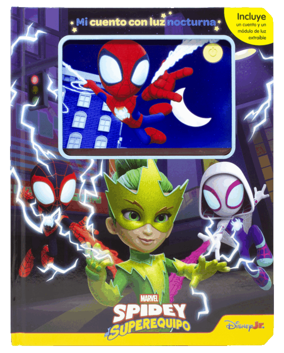 ¡Enciende la luz y tu imaginación antes de dormir con Spidey y su superequipo! Mi cuento con luz nocturna es un formato que incluye un módulo de luz nocturna extraíble que se apaga automáticamente a los cinco minutos, un soporte desplegable para el libro y un cuento que ayudará a los más pequeños a dormir bien.